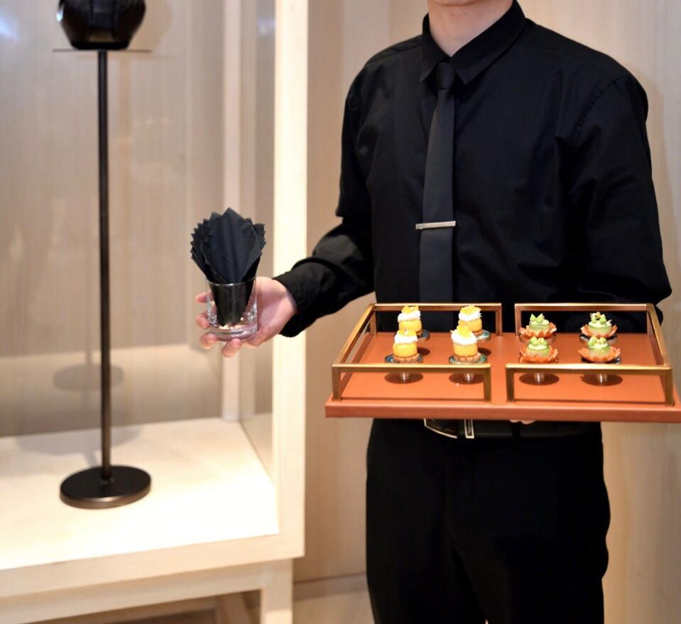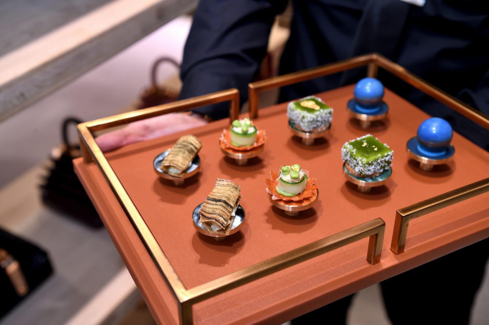 The serving trays were custom-designed to match both the gold trim and materials of the Gabriela Herst handbag collection. Each canape was placed on it's own bronze pedestal, inspired by the collection's finishing.